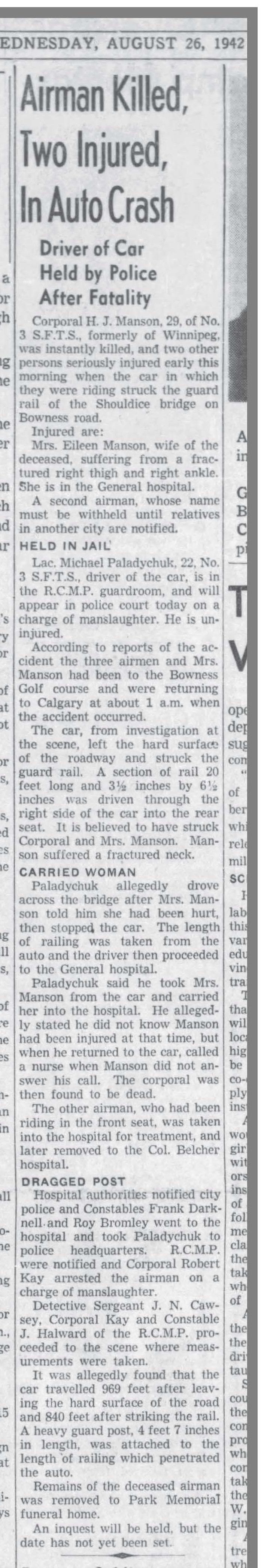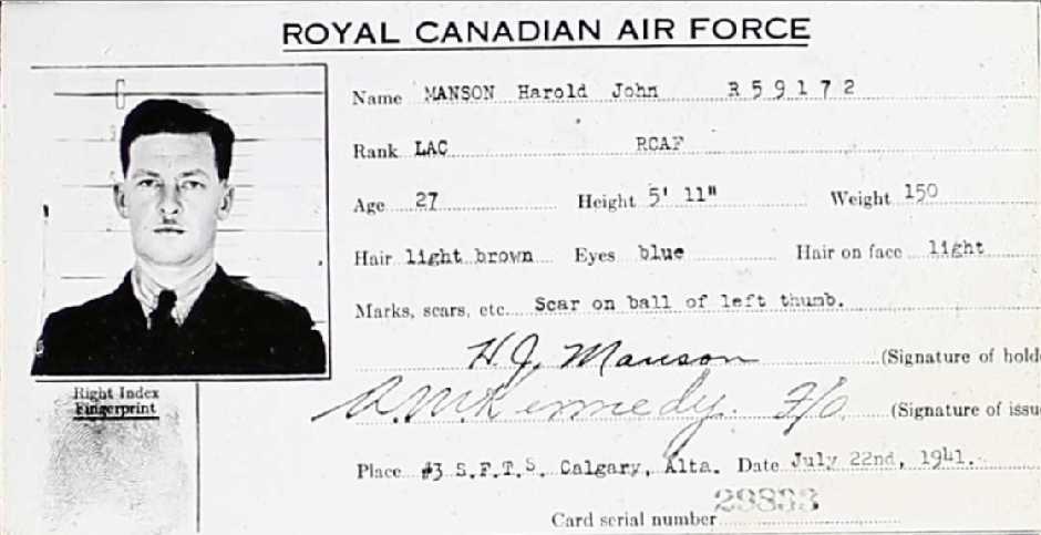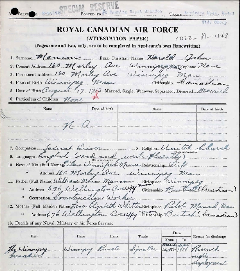 Fils de William Main Manson et Lena E. Manson, de Winnipeg. Époux d' Eileen W. Manson, de Calgary, Alberta.