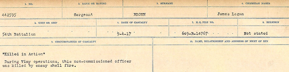 Fils de William et Hannah Logan Brown, de Kelso, Roxburghshire. Frère de Helen Agnes Brown, de Winnipeg, Manitoba.