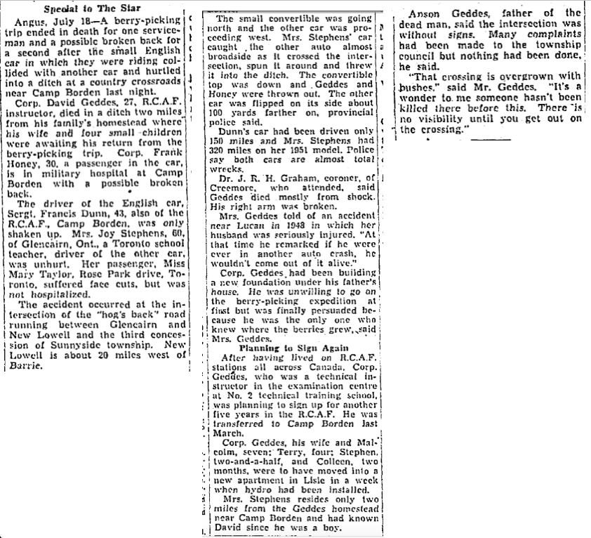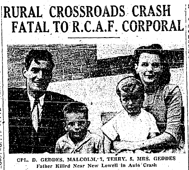 Fils de Anson J. and Emily I. Geddes de Lisle, Ontario. Époux de Mary Kathleen Geddes. Père de Malcolm, Terry, Steven, Colleen Geddes de Lisle, Ontario. Frère de John R., Anson C., Sydney R., Juan R., Anne Geddes, et Mme J. Ormay.