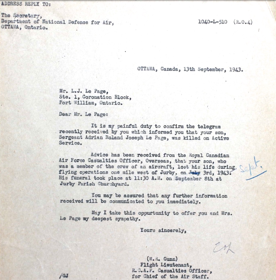 Fils de Lawrence J. Le Page et Marie T. Le Page, de Fort William, Ontario.