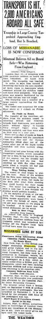 Le Missanabie faisait la route de Liverpool, Angleterre, Québec et Montréal, Québec, lorsque le 9 septembre 1918 il a été torpillé par l’UB-87 à 52 milles (84 km) au large de Daunt’s Rock, Cork, Irlande. Il a coulé avec 45 membres de son équipage, position 58°11’N/07°25’O.