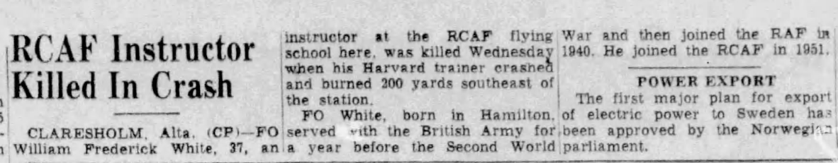 Fils de Norman Macleod et Catherine Florence (née Abbott)White. Époux de Sheila (née Percival) White et père de Kay, Patrica et Sheila White de Claresholm, Alberta. Frère de Kay Rambo et James MacLeod White.