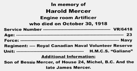 Le cimetière commémoratif de Victoria se trouve dans le cimetière de Ross Bay sur l'Île de Vancouver en Colombie-Britannique. Le cimetière compte 133 sépultures de guerre. On y retrouve également, dans un lot séparé, le " Naval Memorial " : il s'agit d'un bloc carré de granite sur lequel sont inscrits les noms de 39 officiers et hommes portés disparus ou inhumés dans l'Océan Pacifique. Trente-six de ces hommes naviguaient sur le HMCS Galiano qui a coulé le 30 octobre, 1918. Derrière le cimetière commémoratif de Victoria se trouve une croix du sacrifice.