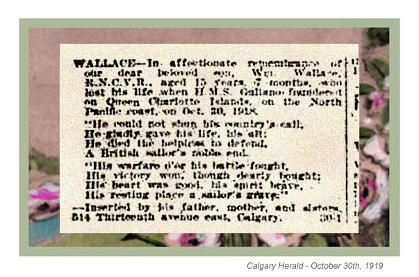 Le cimetière commémoratif de Victoria se trouve dans le cimetière de Ross Bay sur l'Île de Vancouver en Colombie-Britannique. Le cimetière compte 133 sépultures de guerre. On y retrouve également, dans un lot séparé, le " Naval Memorial " : il s'agit d'un bloc carré de granite sur lequel sont inscrits les noms de 39 officiers et hommes portés disparus ou inhumés dans l'Océan Pacifique. Trente-six de ces hommes naviguaient sur le HMCS Galiano qui a coulé le 30 octobre, 1918. Derrière le cimetière commémoratif de Victoria se trouve une croix du sacrifice.