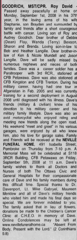 Fils de Roy Goodrich de Seeley's Bay, Ontario et Audrey Goodrich de Trenton, Ontario Époux de Stephanie Anne Langille de Lyndhurst, Ontario. Étape Père de Braydon Robert Langille. Frère de Debbie, Wanda, Sharon et Brenda.