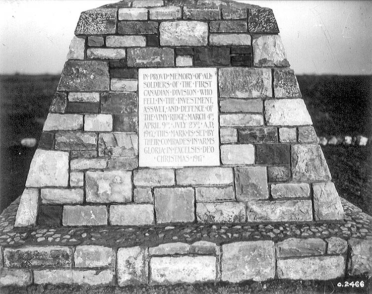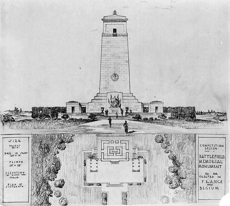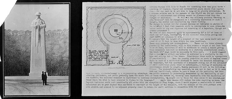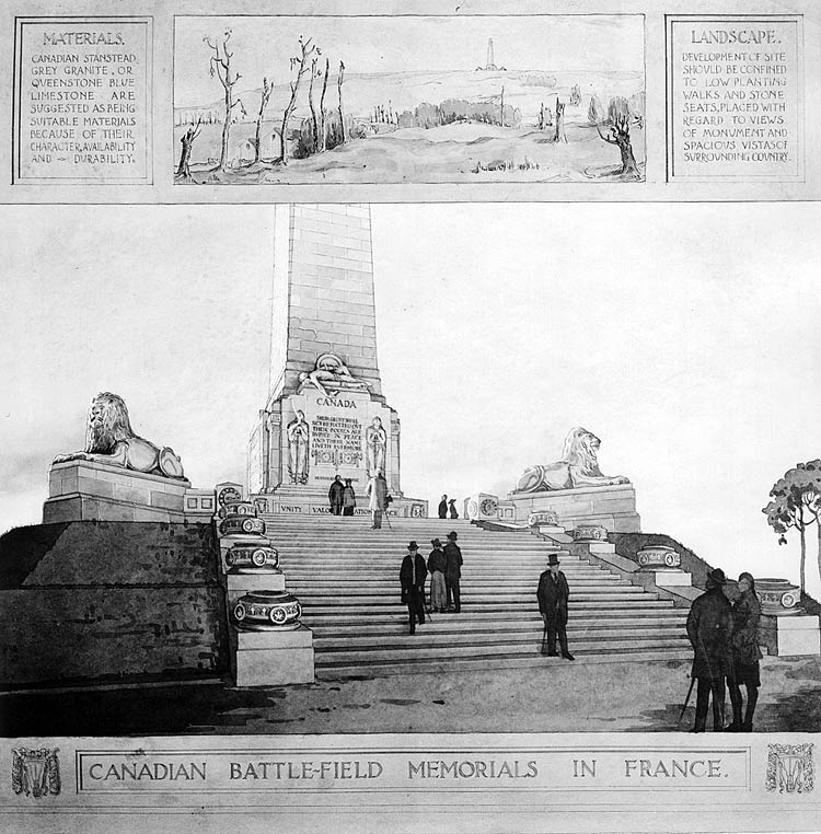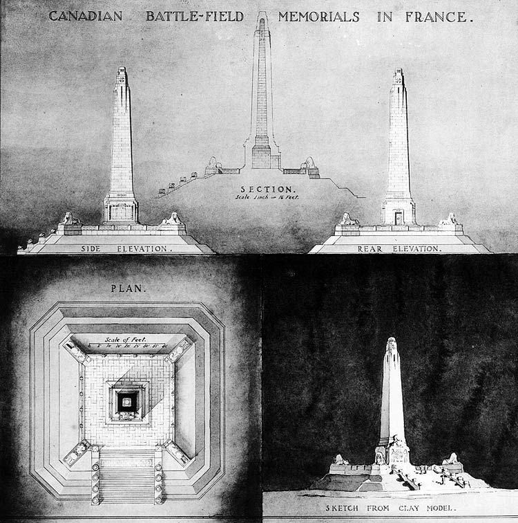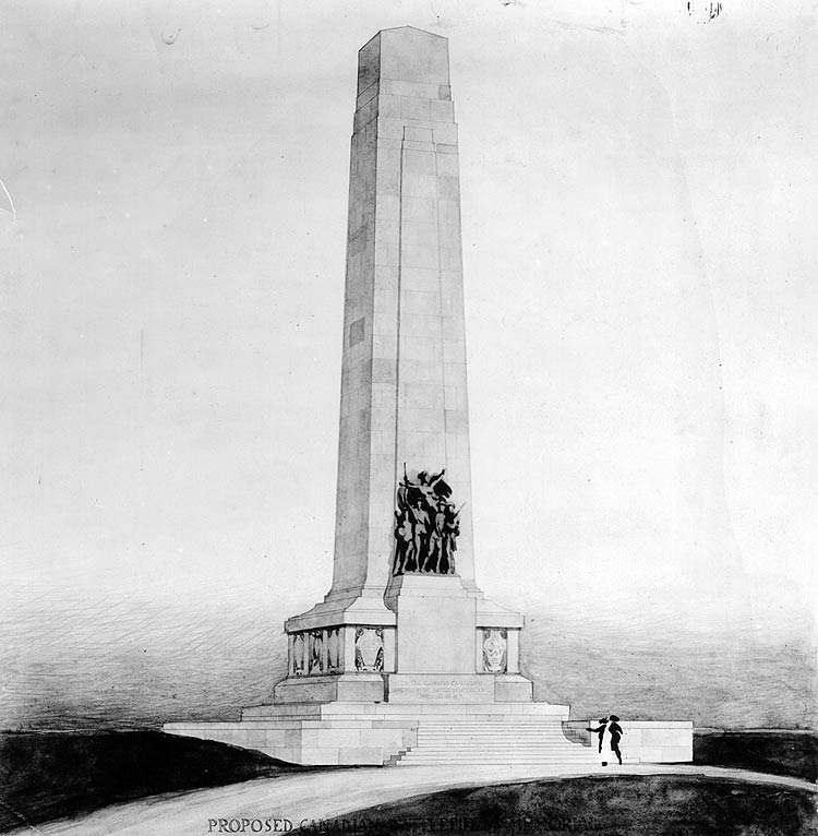 En 1920, la Commission des monuments des champs de bataille nationaux a été mise sur pied pour superviser l’érection de huit monuments commémoratifs canadiens. La première étape consistait en un concours de conception de monuments commémoratifs, ouvert à tous les architectes, designers, sculpteurs et autres artistes canadiens.