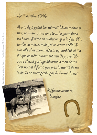 John McCrae a écrit beaucoup de lettres à sa famille au Canada pendant la guerre. Il mentionne souvent Bonneau, le chien abandonné qu’il a adopté lorsqu’il était à l’étranger, et Bonfire. Voici un extrait d’une de ces lettres :