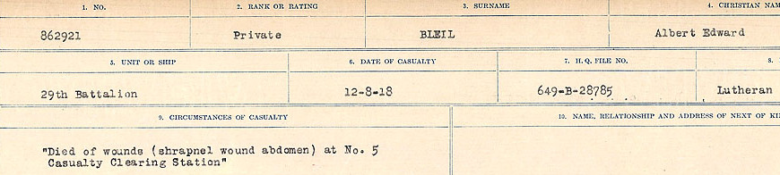 Frère du soldat Charles Oscar Bleil, décédé au service du Canadian Infantry (British Columbia Regiment).