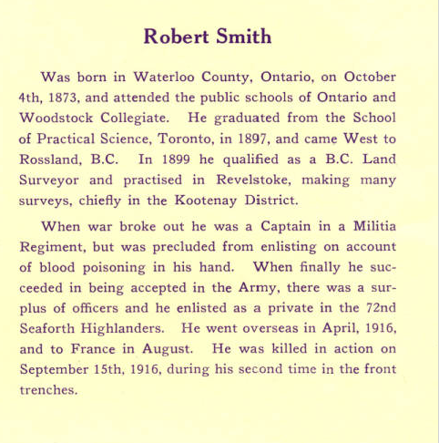 Frère de Miss J. W. Smith, de 13, Barrie Avenue, Toronto. Originaire de Waterloo Co., Ontario.