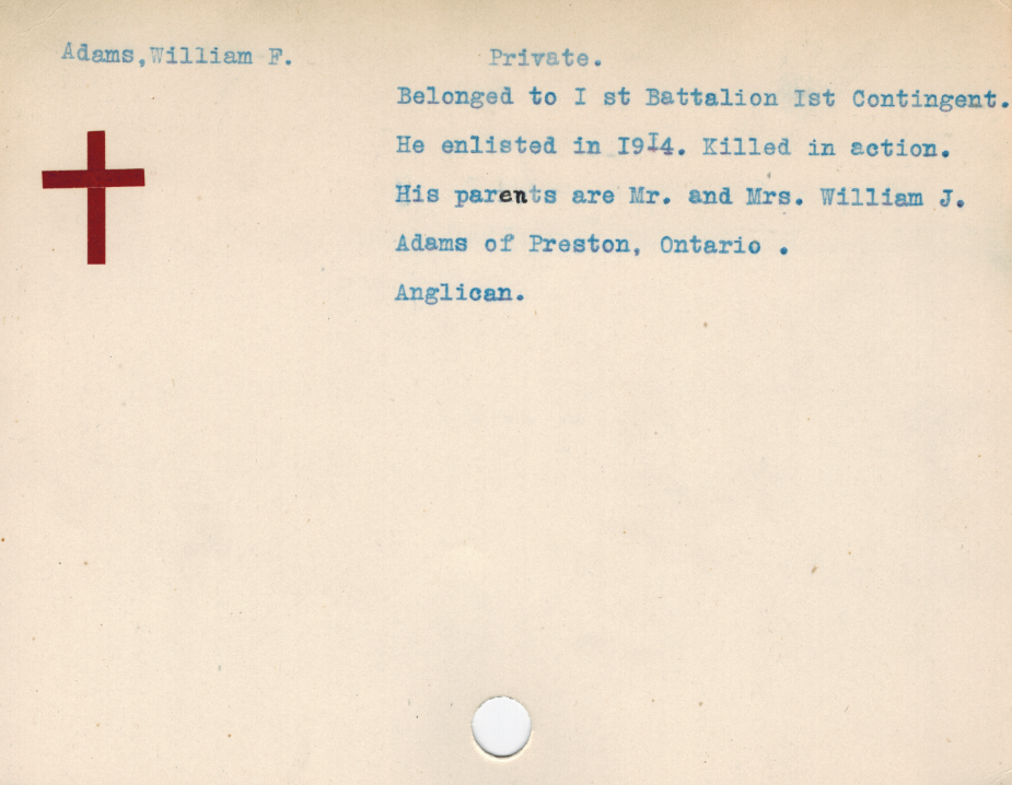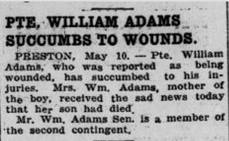 Fils de William et Bridget Adams, de Preston, (Ontario).