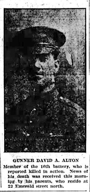 Fils de Thomas B. et Agnes Alton, de Hamilton, Ontario. Il s'est enrolé avec le 16th Howitzer Bty.
