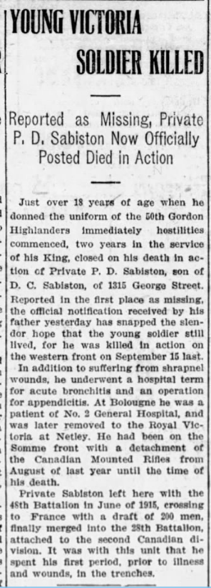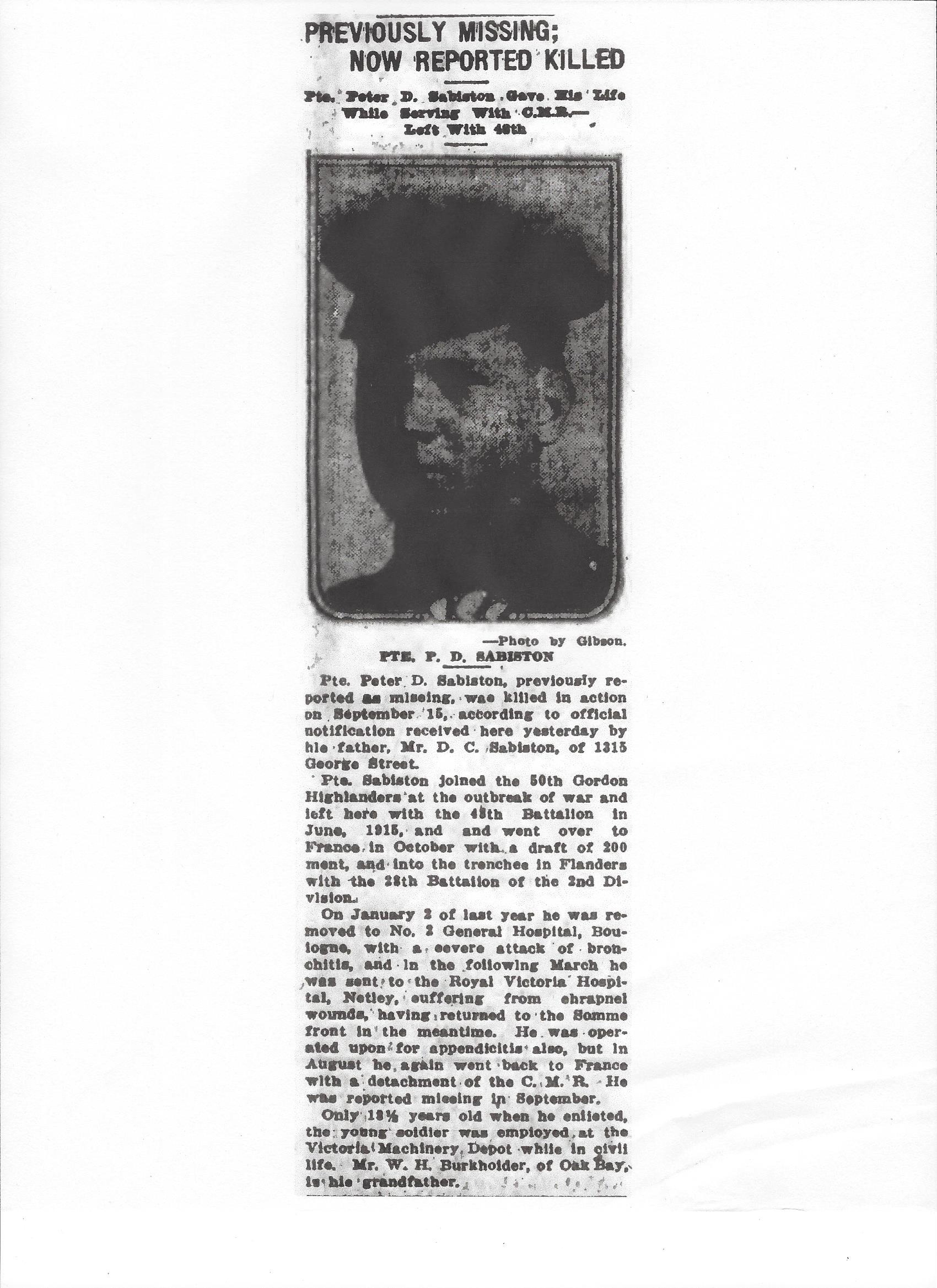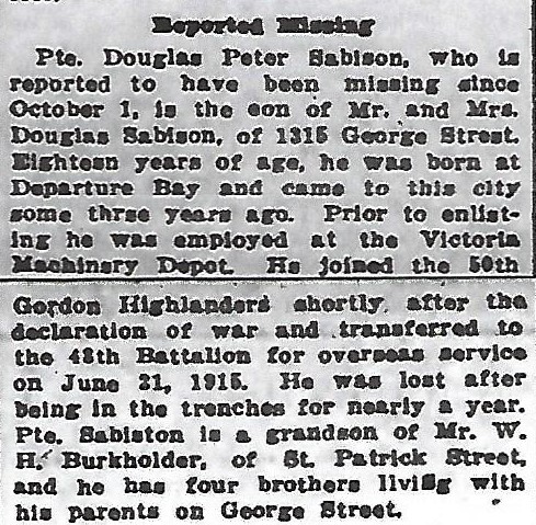 Fils de Douglas et Alberta Sabiston, de 1315, George St., Victoria, Colombie-Britannique. Né à Nanaimo, Colombie-Britannique.