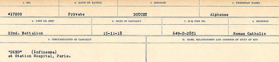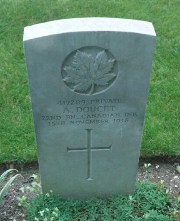 Enrôlé au 57e Bataillon du Corps expéditionnaire canadien, matricule 48633 il est affecté au 41e Bataillon à une date non précisée au dossier. Il traverse en Angleterre le 16 octobre 1915 avec cette unité et débarque à Plymouth le 28. Il passe au 23e Bataillon le 20 avril 1916, puis au 22e Bataillon le 28 juin suivant, matricule 417209. Il arrive à Boulogne, Pas-de-Calais, France, le 29 juin et monte en première ligne le 13 juillet. Il est légèrement blessé au combat à une jour le 6 août 1916 à Vierstraat, Ypres, en Belgique .Le 25 août, il est affecté au 2nd Canadian Entrenchment Battallion jusqu’à une date non mentionnée au dossier. Le 9 avril 1917, il est à nouveau blessé au combat à un doigt sur la crête de Vimy, France, alors qu’il sert avec le 22e Bataillon. Le 10 novembre 1918, il est admis à un hôpital à Paris pour être soigné de l’influenza. Décédé de la grippe espagnole (influenza), quatre jours après la fin des hostilités.Galerie numérique de Soldat Alphonse Doucet