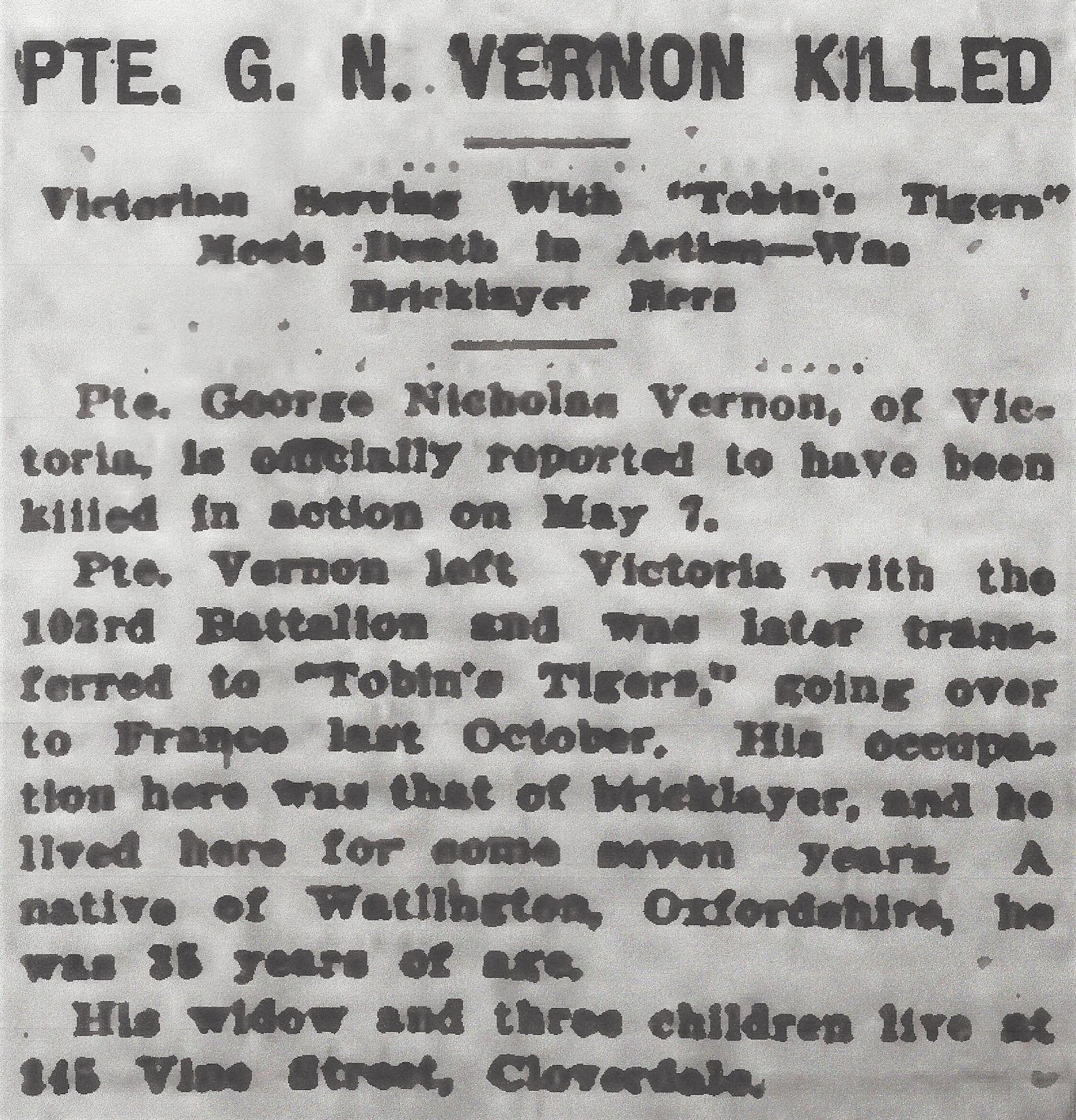 Fils de Henry Vernon, de Watlington, Oxon; époux de Mabel M. Vernon, de Furlong Rd., Bourne End, Bucks.