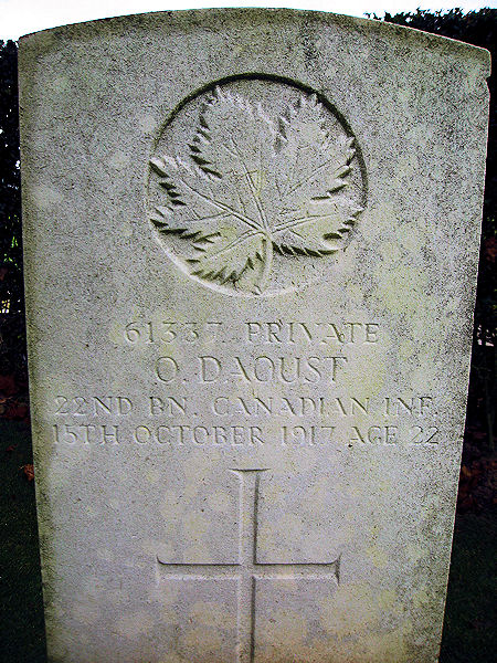 Enrôlé au 22e Bataillon du Corps expéditionnaire canadien, il arrive à Plymouth, Angleterre, le 29 mai 1915. Le 15 septembre suivant, il débarque à Boulogne, Pas-de-Calais, France. Légèrement blessé à la cheville droite, entorse, le 3 mai 1917, il reprend du service le 16 mai suivant. Prêté au 2nd Canadian Entrenchment Battalion du 14 juin au 31 juillet 1917, il revient au 22e Bataillon. Il est affecté à la 5e Brigade de mortiers eu 8 août au 15 octobre 1917. Sur le chemin du retour vers le 22e Bataillon il est tué au combat le 15 lors de la bataille de Lens, France. Au moment de sa mort, Ovila fils était attaché depuis deux mois à la 5e Batterie de mortiers légers de tranchées. Au baptême de son fils et à son propre enrôlement Ovila père a signé « D’Aoust » alors que le fils a signé simplement « Daoust ».