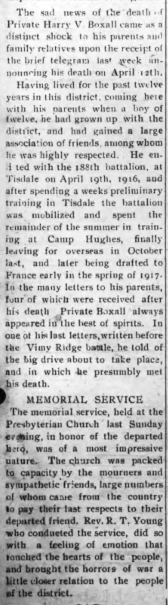 Fils de Henry J. Boxall et Mary Pearse, son épouse, de Tisdale, Saskatchewan.