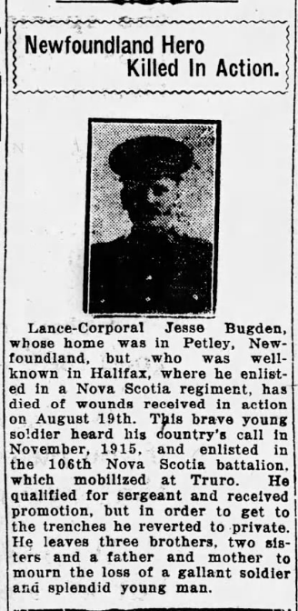Fils de Jesse et Charity Bugden, de Petley, Britannia, Terre-Neuve.