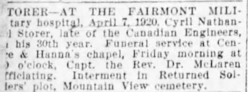 Cyril died at Vancouver BC on April 7th 1920 at the age of 29. He was laid to rest in the Mountain View cemetery of Vancouver BC.