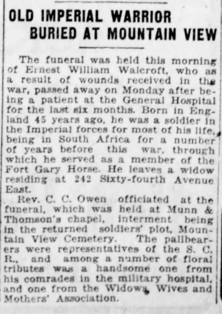 Grave of 15597 Pvt. Ernest William Walcroft who served in the Fort Garry Horse Regt. C.E.F. Born in London England on Nov. 4th 1874. Husband of Mary E. Walcroft of South Vancouver.