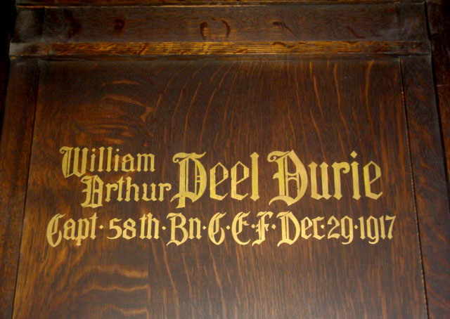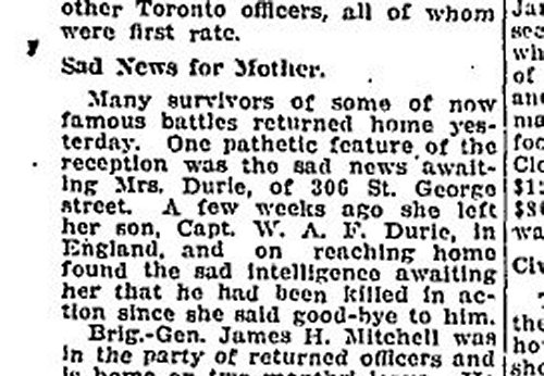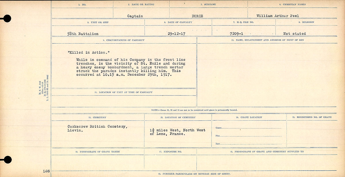 Fils de feu Lt. Col. Durie, D.A.G., Military Dist. No. 2, et Anna Durie, de Toronto, Ontario. Il à était blessé en mai 1916 en salient d'Ypres. Anciennement enterré dans la Loos British Cemetery.