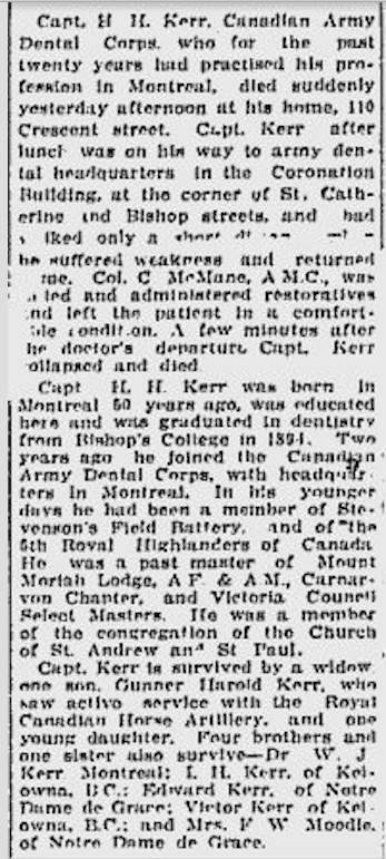 Fils de feu Samuel Kerr et feu Elizabeth Watson Kerr; époux de Grace A. Kerr, de 110, Crescent St., Montréal.