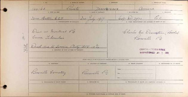 Au Canada, il fut hospitalisé pendant plusieurs mois au Sanatorium de Ste-Agathe-des-Monts et, ne prenant pas de mieux, il fut jugé incurable et libéré du service en tant qu’inapte médical permanent, le 19 mars 1917. Il est mort des suites de sa maladie trois mois plus tard à Montréal et il a été inhumé les jours suivants dans son patelin natal.