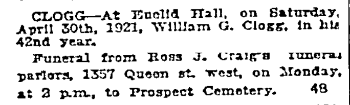 Fils de Mme E. Clogg, de Tamerton, Devon, Angleterre; époux de Annie Maria Clogg, de Toronto, Ontario.
