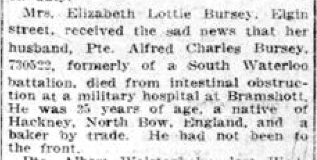 Fils de Eli et L. M. Bursey, de 7, White Post Lane, Hackney Wick, London, Angleterre; époux de Lottie Bursey, de 43, Chalmer St., Galt, Ontario.