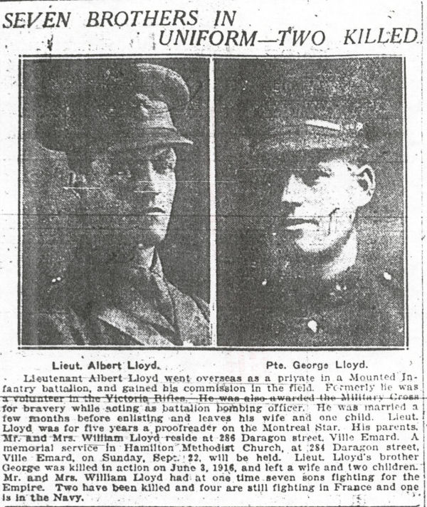 Le lieutenant Albert Lloyd et ses six frères ont tous servi dans la Première Guerre mondiale. Son frère, soldat George Lloyd, décédé au service du Canadian Infantry, Canadian Expeditionary Force.