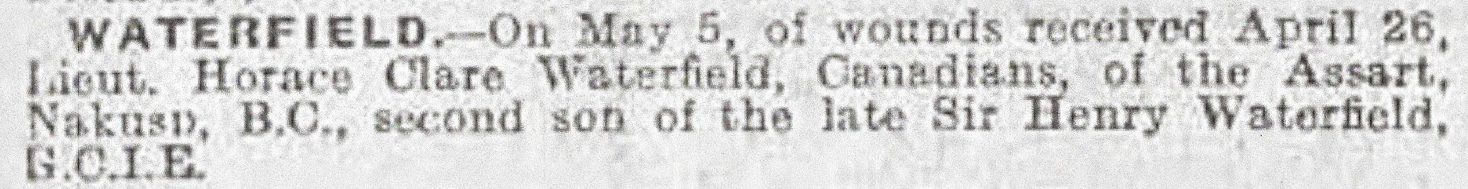 Fils de Sir Henry Waterfield, K.C.S.I., K.C.I.E., C.B.> Époux de Margaret Elspeth Waterfield, de Nakusp, Colombie-Britannique.