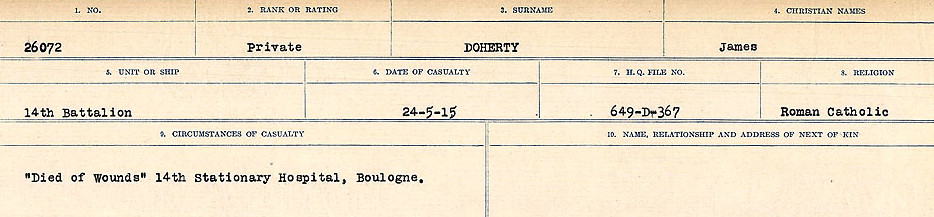 Fils de Jeremiah et Hannah Doherty, de Tralee, Co. Kerry, Irlande. Il a servi pendant trois ans avec les Royal Munster Fusiliers.