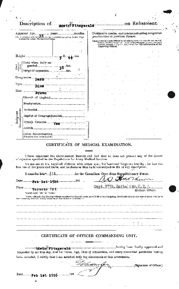 Enrôlement : 1 février 1916 Toronto, Ontario