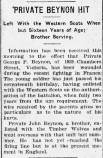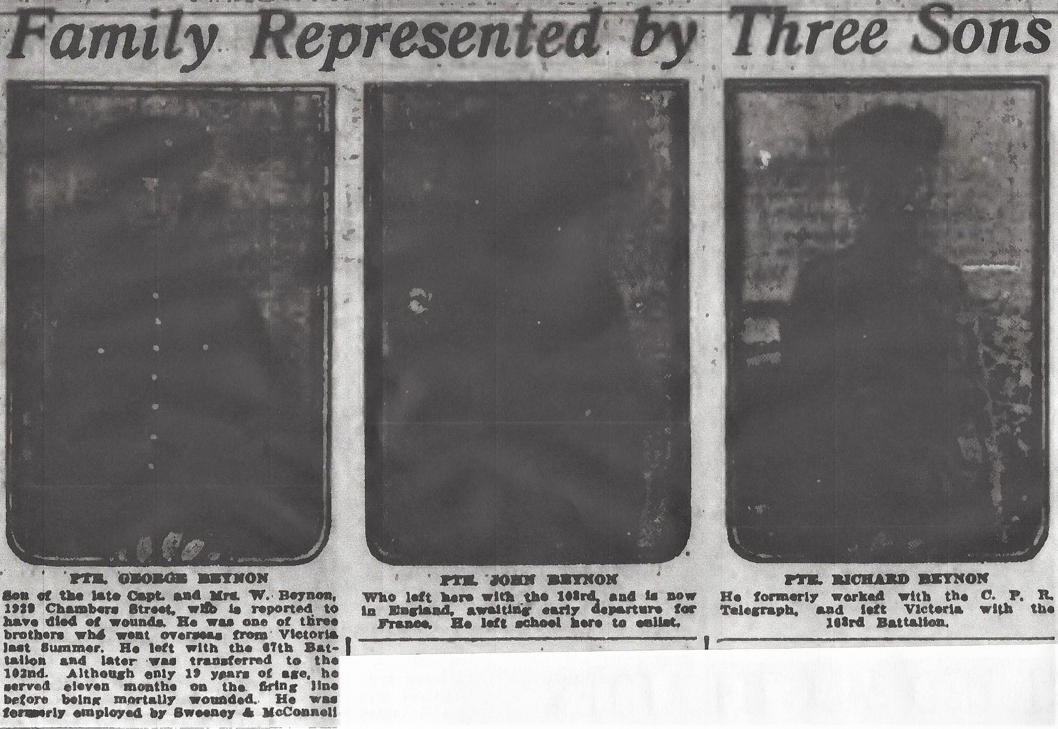 Fils de William et Rebecca Beynon, de Victoria, Colombie-Britannique. Frère de William, John, James, Victor, Fred et soldat Richard Arthur Beynon, 103 batalion, mort des maladies le 22 décembre 1918.