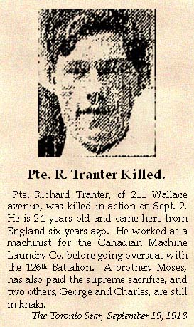 Fils de Moses et Elizabeth Tranter, de 63, Campbell Avenue, Toronto, Ontario. Frère du caporal suppléant Moses Tranter, décédé le 17 août 1917, pendant qu’il servait dans le Canadian Infantry (Central Ontario Regiment).