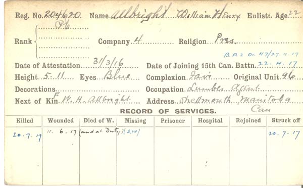 Frère du caporal suppléantl George Nelson Allbright, décédé le 19 février 1917 pendant qu’il servait dans le Canadian Infantry (New Brunswick Regiment).