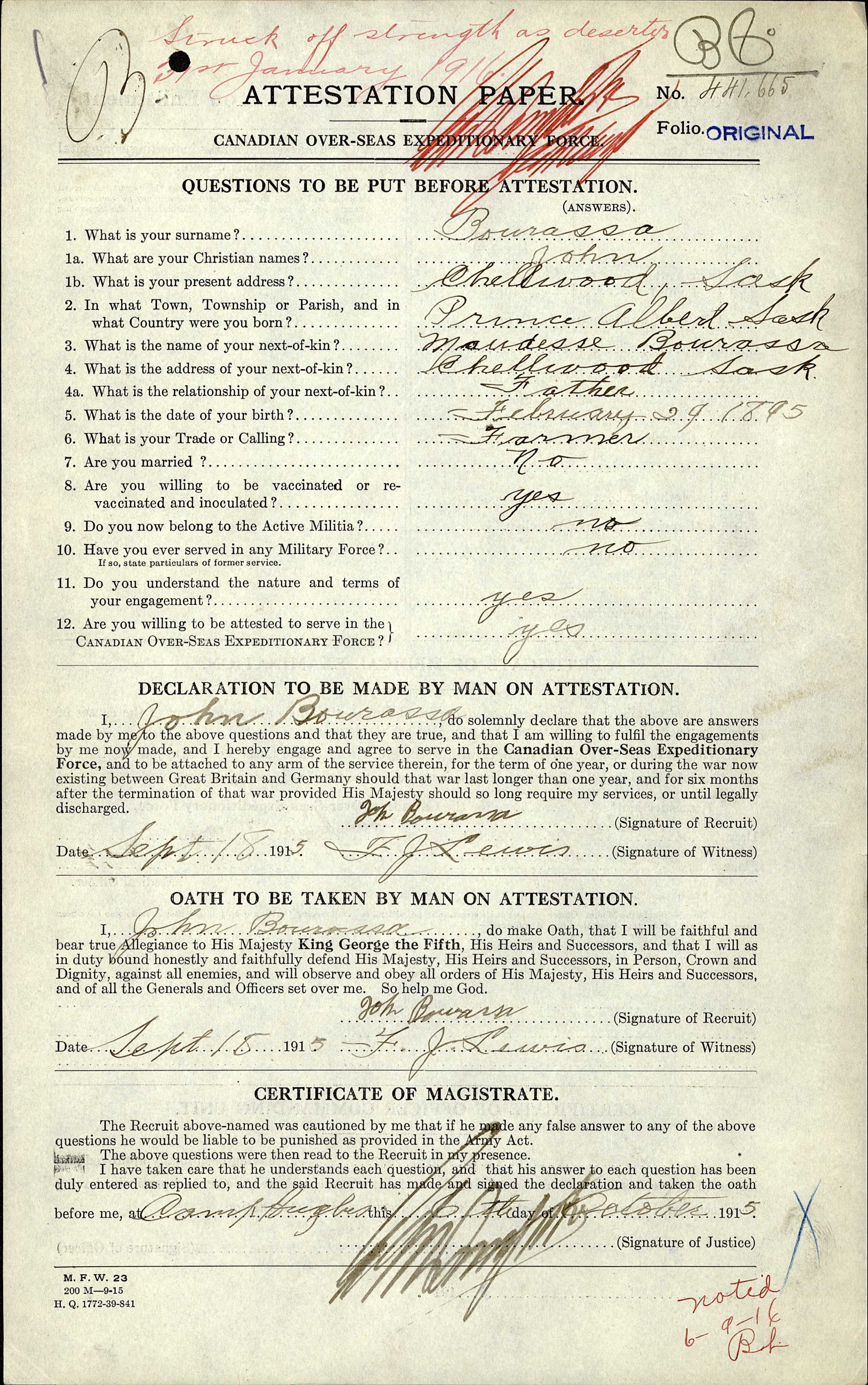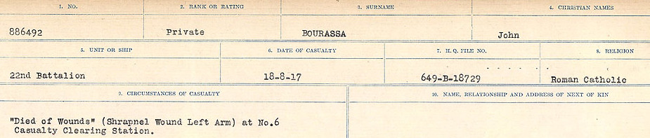 Frère du soldat Joseph Bourassa, tué au combat avec le 5e Bataillon, durant la bataille d’Amiens.