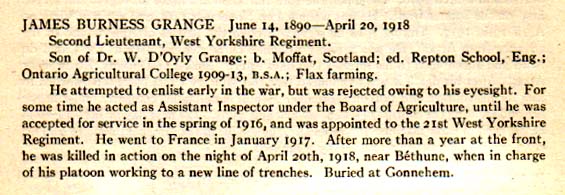 Fils de William D'Oyly Grange, M.D. (Il faisait parti du 3rd Volunteer Bn. K.O.S.B.)et Mme Grange (née Burness)de Harrogate. Né à Moffat, Dumfriesshire. Bachelier ès sciences de l'Université de Toronto et inspecteur adjoint du Board of Agriculture en Angleterre.