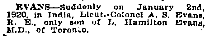 Fils de feu le docteur Lewis Hamilton Evans et de Blanche Evans (née Arnold); époux d'Annie Amelia Evans, de Kingston, en Ontario, au Canada. Il servit dans le cadre d'une expédition en Somalie (1902-1904).