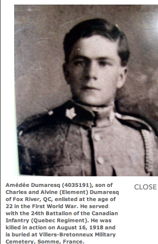 Fils de Charles Dumaresq et son épouse Alvine Element, de Fox River, Gaspe Co., P.Q., Canada.