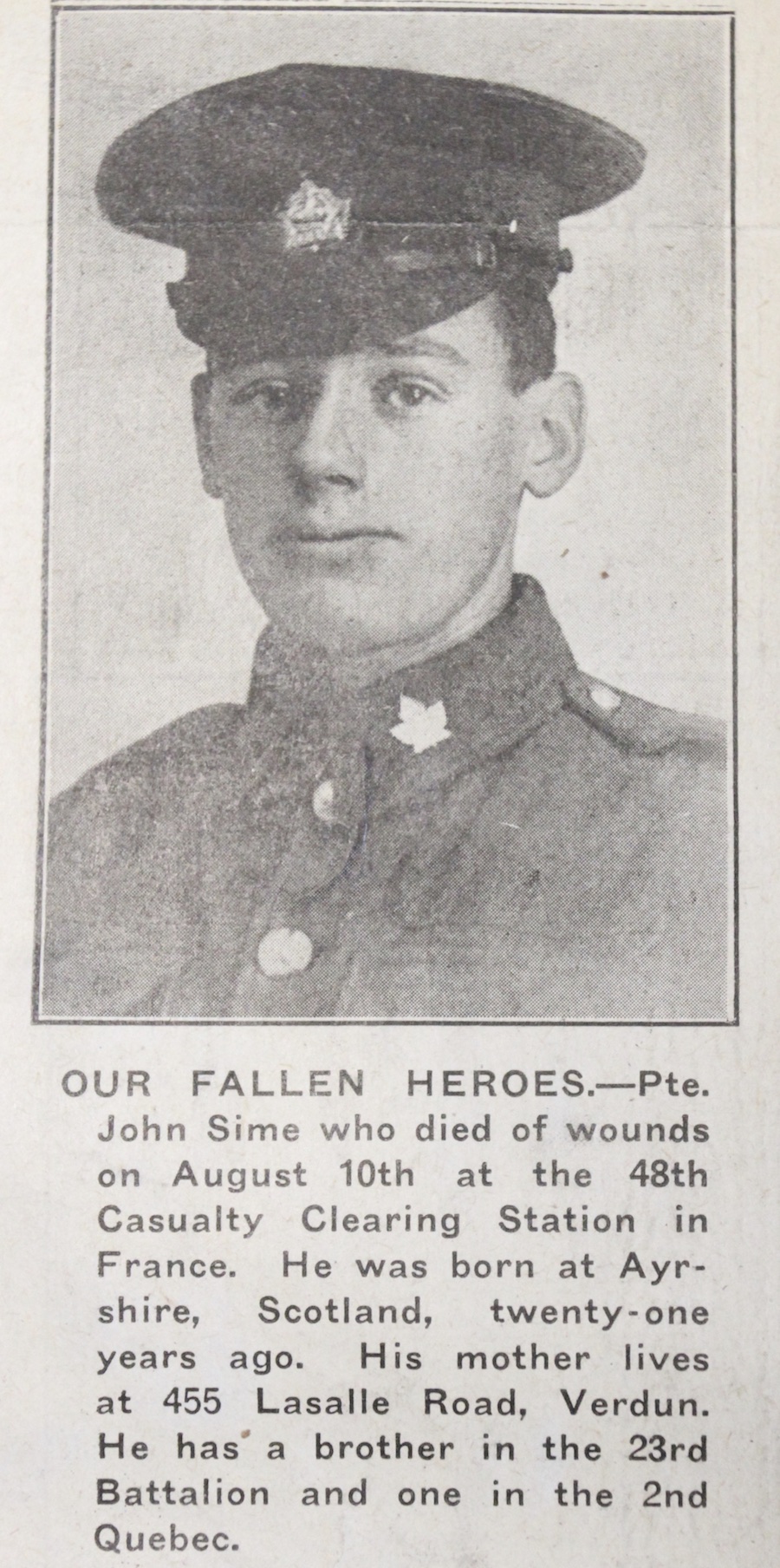Fils de David et Margaret Sime, de 2095, Hutchison St., Montréal. Né à Ayr, Écosse