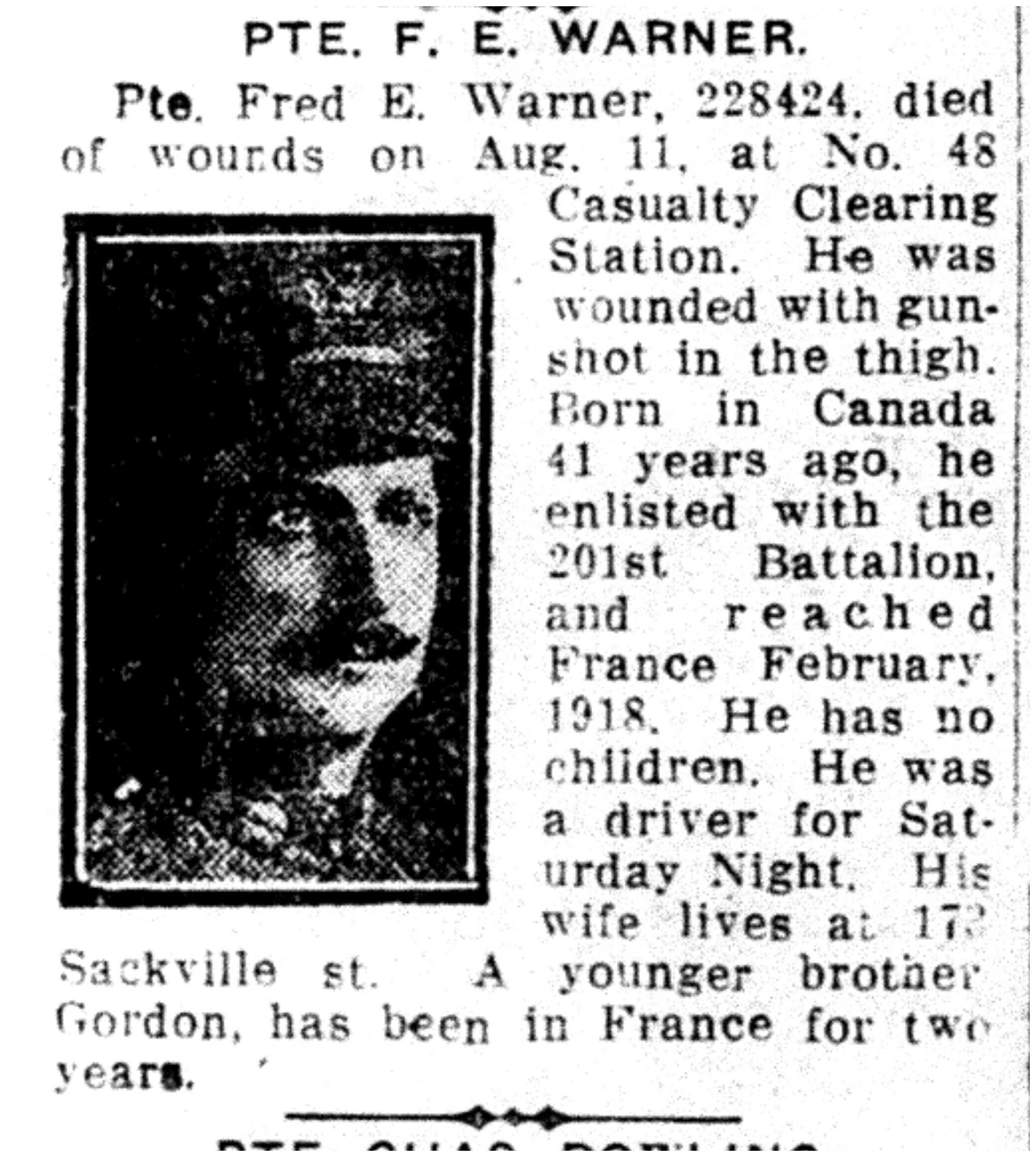 Fils de M. I. P. et feu Mme I. P. Warner; époux de Margaret Warner, de 366, Ontario St., Toronto.