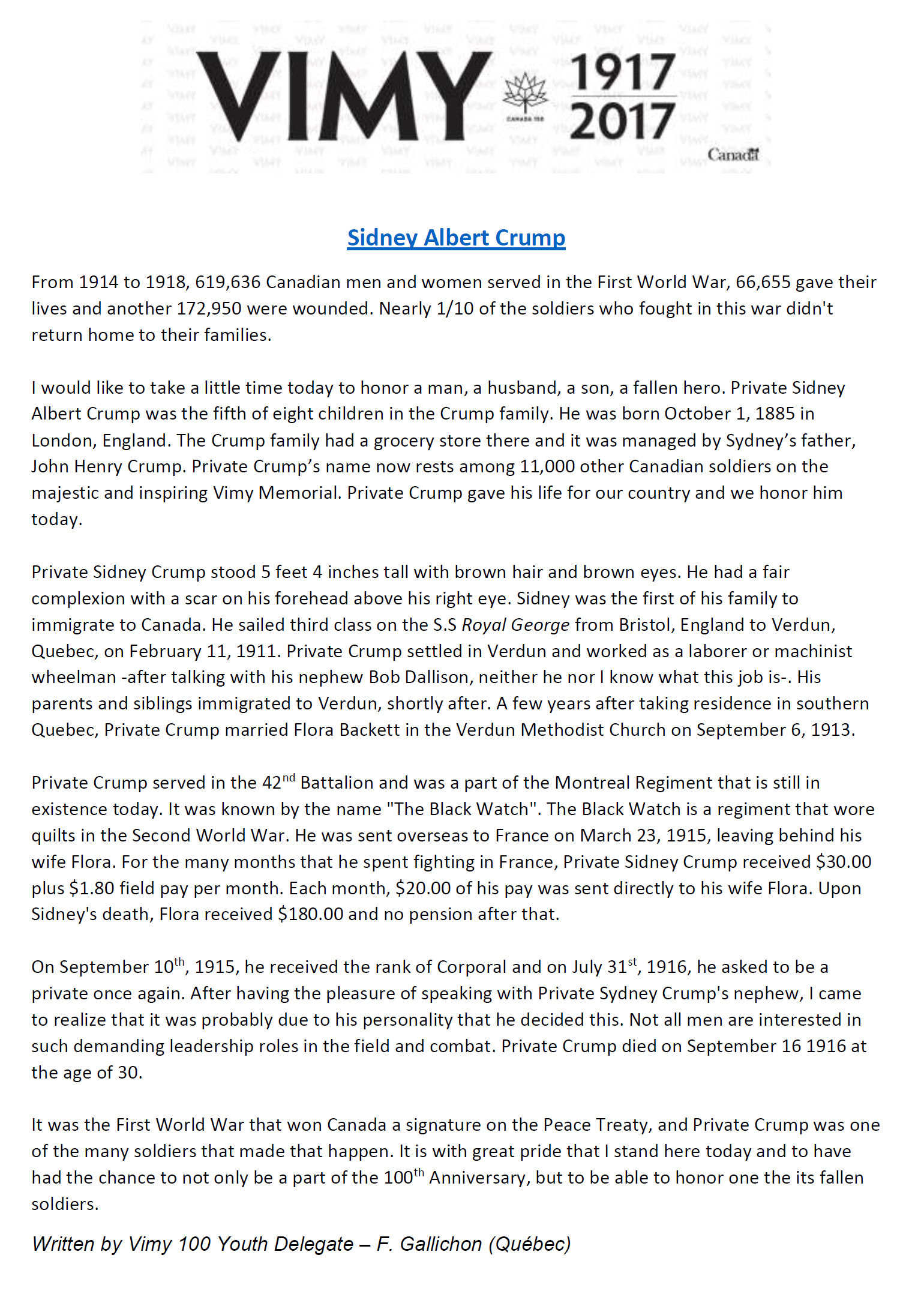 L'hommage le plus impressionnant que le Canada a rendu à ceux de ses citoyens qui ont combattu et donné leur vie au cours de la Première Guerre mondiale, a trouvé son expression concrète dans le Monument Commémoratif du Canada à Vimy, qui surplombe majestueusement la plaine de Douai du sommet de la crête de Vimy, à environ huit kilomètres au nord-est d'Arras. Le Monument représente un hommage à tous ceux qui ont combattu pour leur pays durant ces quatre années de guerre et, en particulier, à ceux qui ont donné leur vie. Sur le socle du Monument, sont gravés dans la pierre, en français et en anglais, les mots suivants :