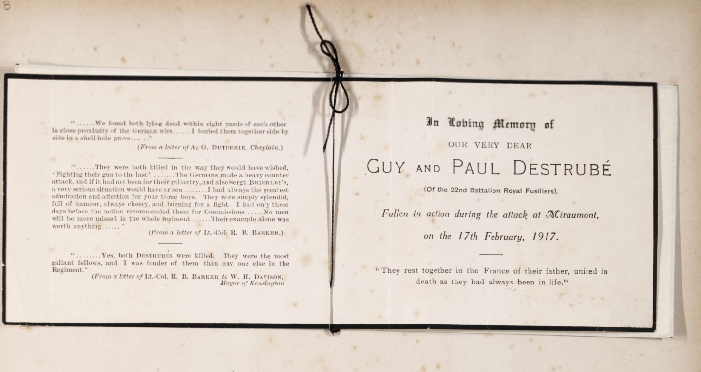 Frère du soldat Paul Jean Destrube, qui servit également avec le Royal Fusiliers. Ils moururent les deux le même jour.
