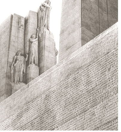 L'hommage le plus impressionnant que le Canada a rendu à ceux de ses citoyens qui ont combattu et donné leur vie au cours de la Première Guerre mondiale, a trouvé son expression concrète dans le Monument Commémoratif du Canada à Vimy, qui surplombe majestueusement la plaine de Douai du sommet de la crête de Vimy, à environ huit kilomètres au nord-est d'Arras. Le Monument représente un hommage à tous ceux qui ont combattu pour leur pays durant ces quatre années de guerre et, en particulier, à ceux qui ont donné leur vie. Sur le socle du Monument, sont gravés dans la pierre, en français et en anglais, les mots suivants :