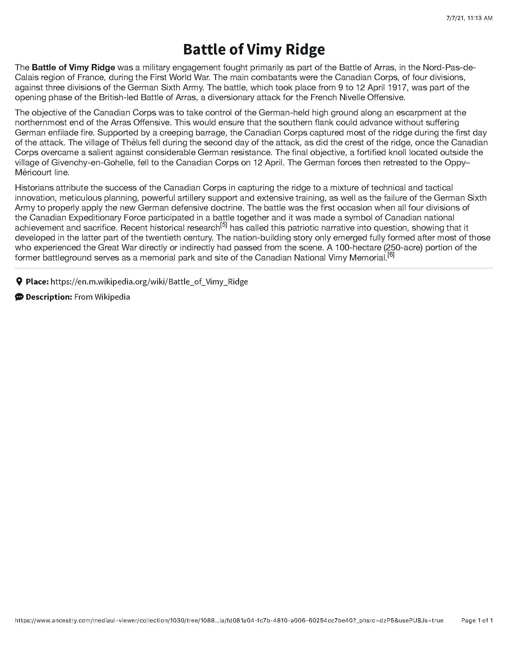 L'hommage le plus impressionnant que le Canada a rendu à ceux de ses citoyens qui ont combattu et donné leur vie au cours de la Première Guerre mondiale, a trouvé son expression concrète dans le Monument Commémoratif du Canada à Vimy, qui surplombe majestueusement la plaine de Douai du sommet de la crête de Vimy, à environ huit kilomètres au nord-est d'Arras. Le Monument représente un hommage à tous ceux qui ont combattu pour leur pays durant ces quatre années de guerre et, en particulier, à ceux qui ont donné leur vie. Sur le socle du Monument, sont gravés dans la pierre, en français et en anglais, les mots suivants :