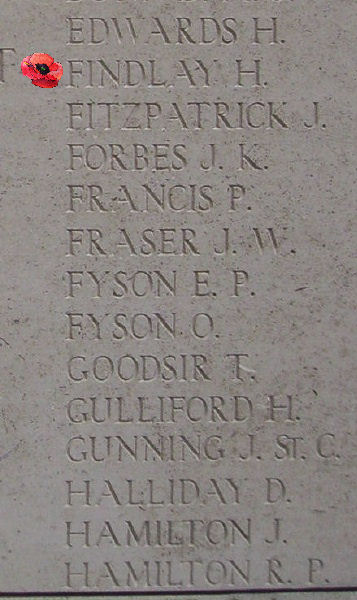 À LA PLUS GRANDE GLOIRE DE DIEU ICI SONT INSCRITS LES NOMS DES SOLDATS QUI SONT TOMBÉS DANS LE SAILLANT D'YPRES, MAIS QUE LES HASARDS DE LA GUERRE ONT EMPÊCHÉS D'AVOIR UNE IDENTITÉ ET UNE SÉPULTURE HONORABLE COMME LEURS CAMARADES DANS LA MORT.