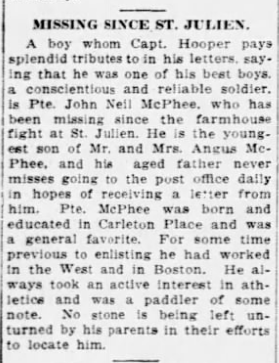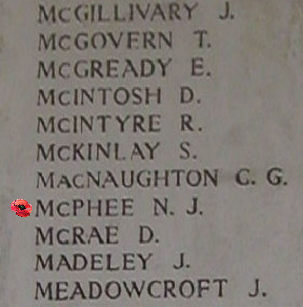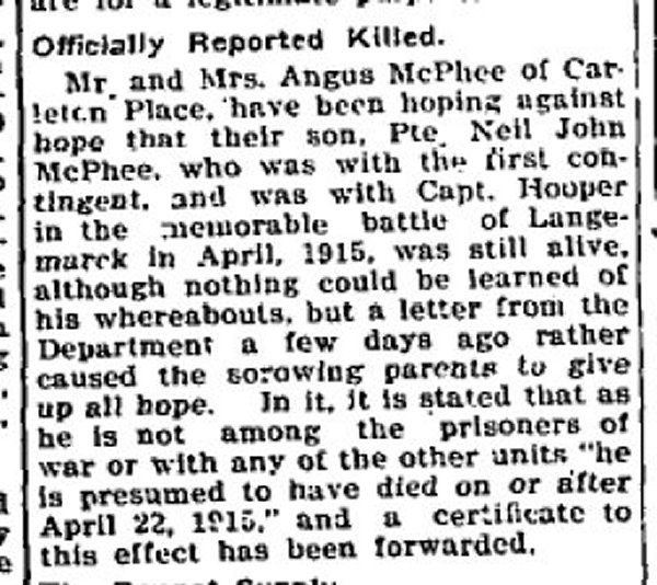 Fils d'Angus McPhee, de Carleton Place, Ontario. Frère de Archibald. Une liste des pertes, publiée dans le Carleton Place Herald le 9 mai 1916 rapporte ce qui suit : Les dernières nouvelles reçues de ceux qui ont survécu, lorsque la maison que le Capt W. H. Hooper et ses nobles hommes défendaient a explosé, sont que le Soldat Neil McPhee. a perdu la vie dans l'explosion.