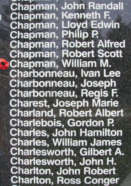 Frère du lieutenant d’aviation Kenneth Louis Chapman, matricule J-26001, de la 178e escadrille de la RAF, tué au combat le 5 novembre 1944, et du sergent Walter Gray Chapman, de l’Aviation royale du Canada, qui a survécu aux combats de la Seconde Guerre mondiale.