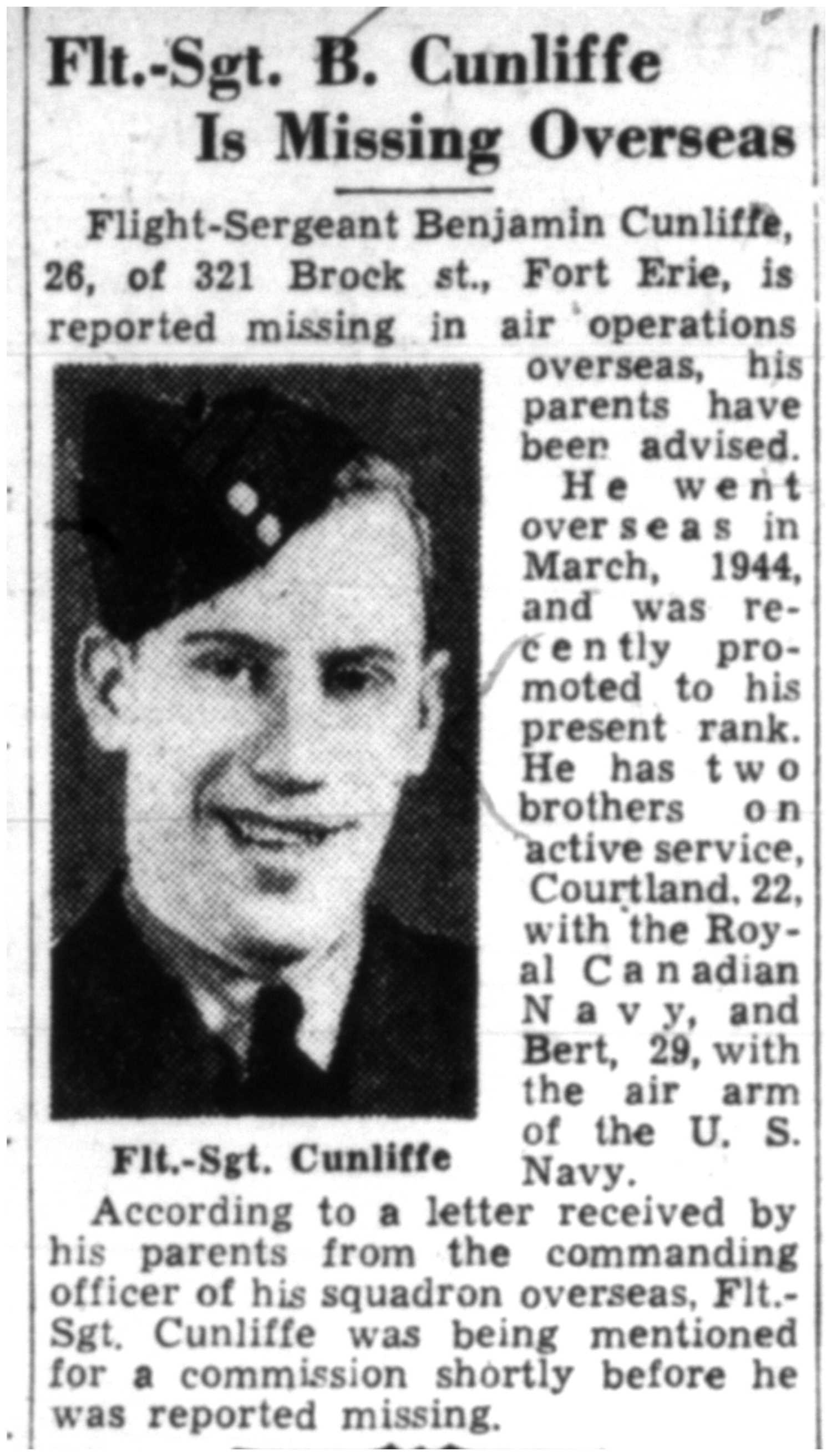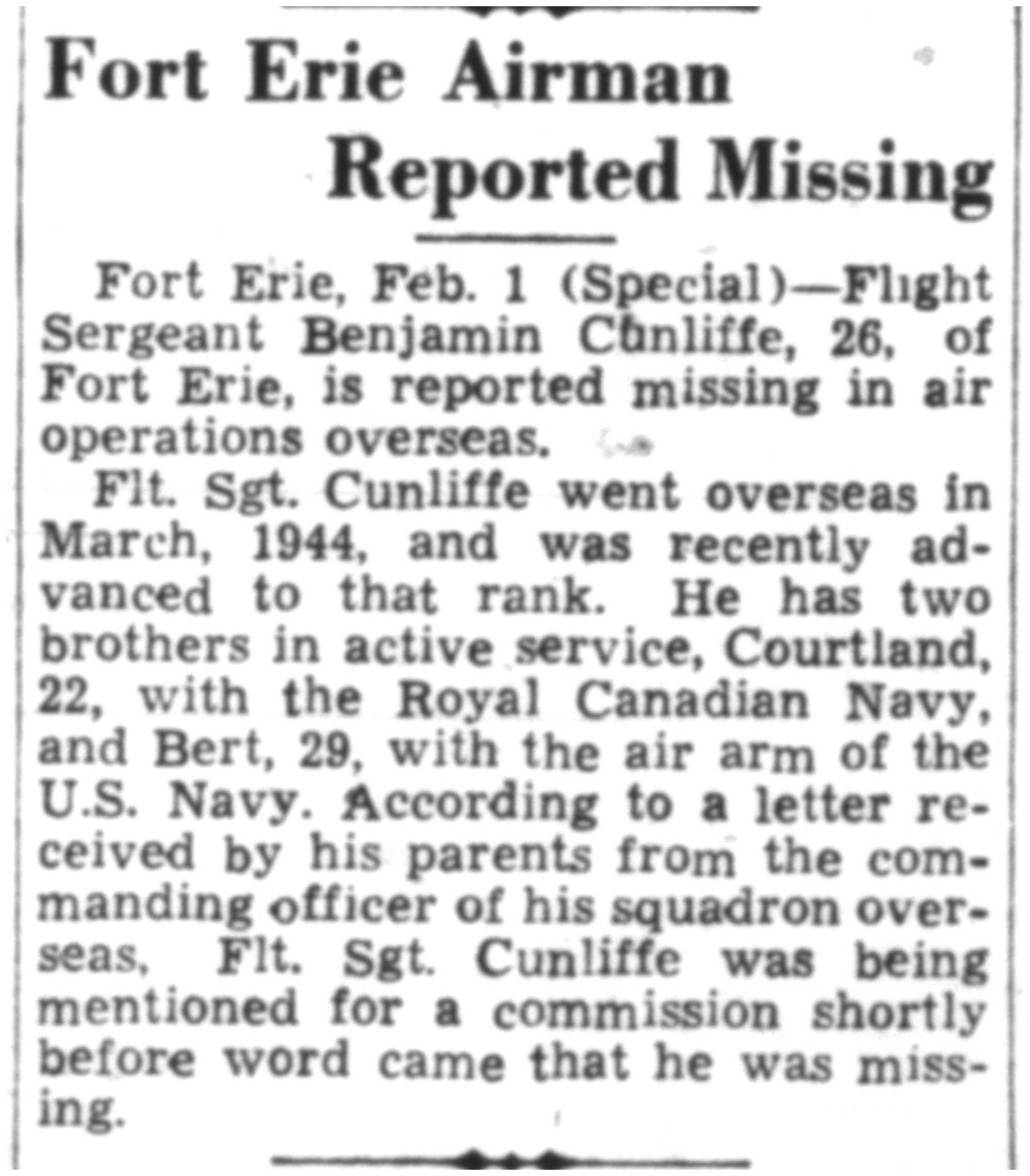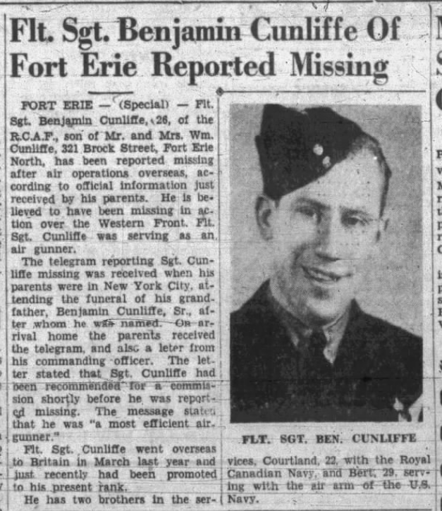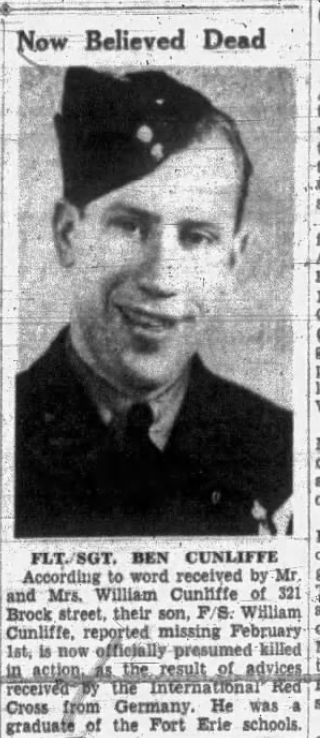 Fils de William et Eva Eudora Russell Cunliffe, de Fort Erie, Ontario, Canada.