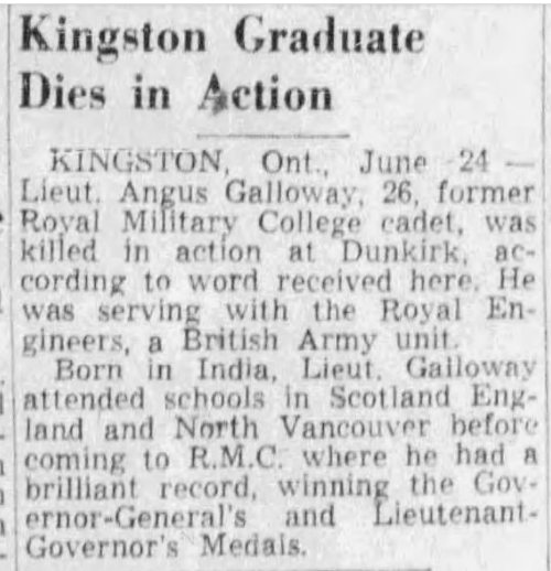 Son of Frederic W. and Edith A. GallowaY, of Duncan, British Columbia, Canada. B.A., Hons. (Cantab.). Il a reçu la Médaille du Gouverneur général et la Médaille du Lieutenant gouverneur de l'Ontario au Collège militaire royal à Kingston. Il a aussi reçu la médaille commémorative Fowke (Chatham).